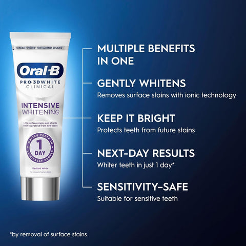 Oral-B Pro 3D White Clinical Intensive Whitening toothpaste is clinically proven for whiter teeth in 1 day by removal of surface stains. It is Oral-B’s best whitening toothpaste with its unique Ionic Technology: It loosens stains without scrubbing, removes stains with Ionic Whitening, protects teeth from future stains and is suitable for sensitive teeth.